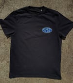 Black t-shirt with blue and white Ninety Plus logo print front and back.