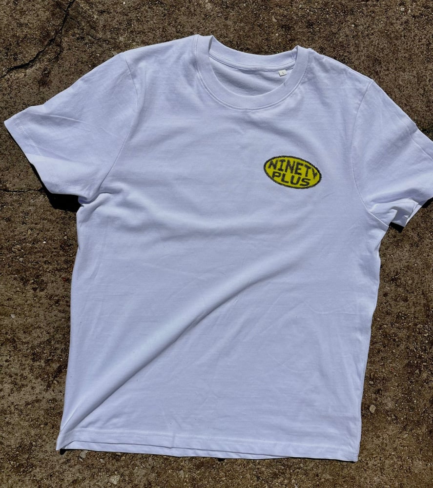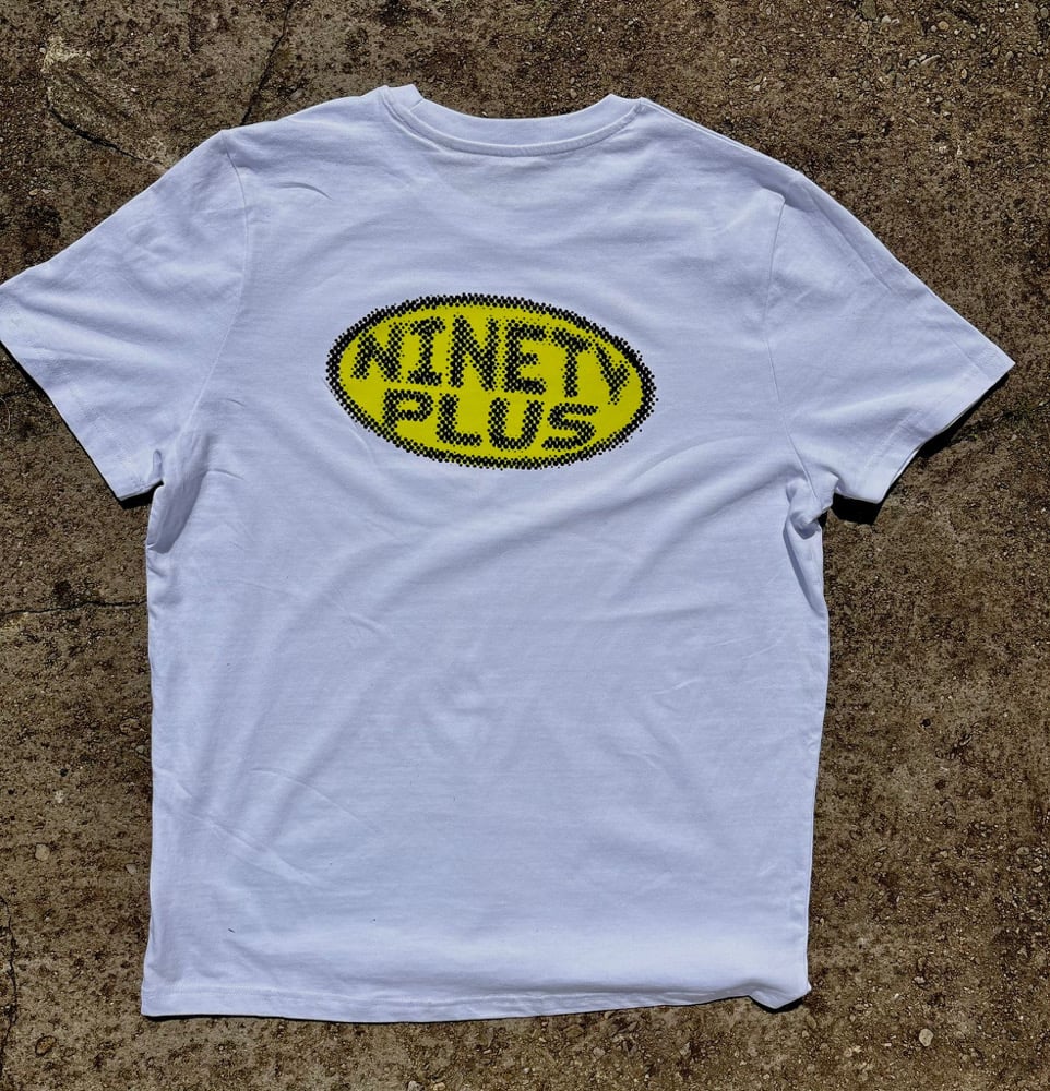 White t-shirt with neon yellow and black Ninety Plus logo print front and back.