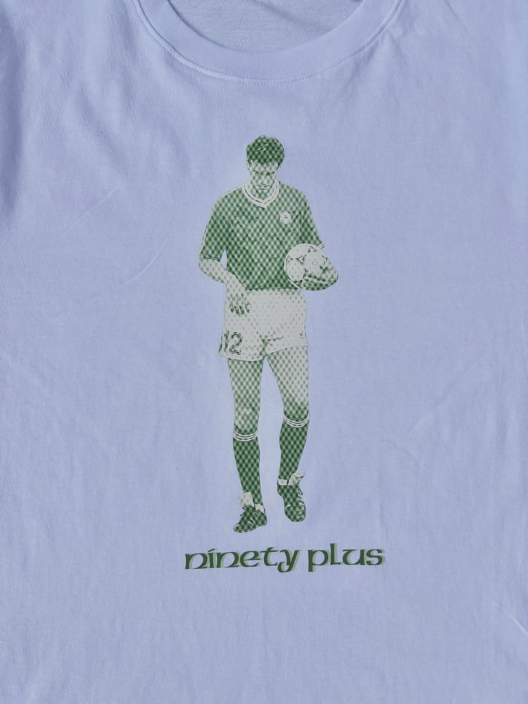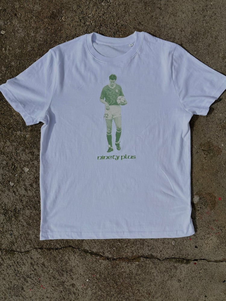 White t-shirt with green front design print inspired by Ireland’s historic winning penalty against Romania at the Italia ‘90 World Cup.